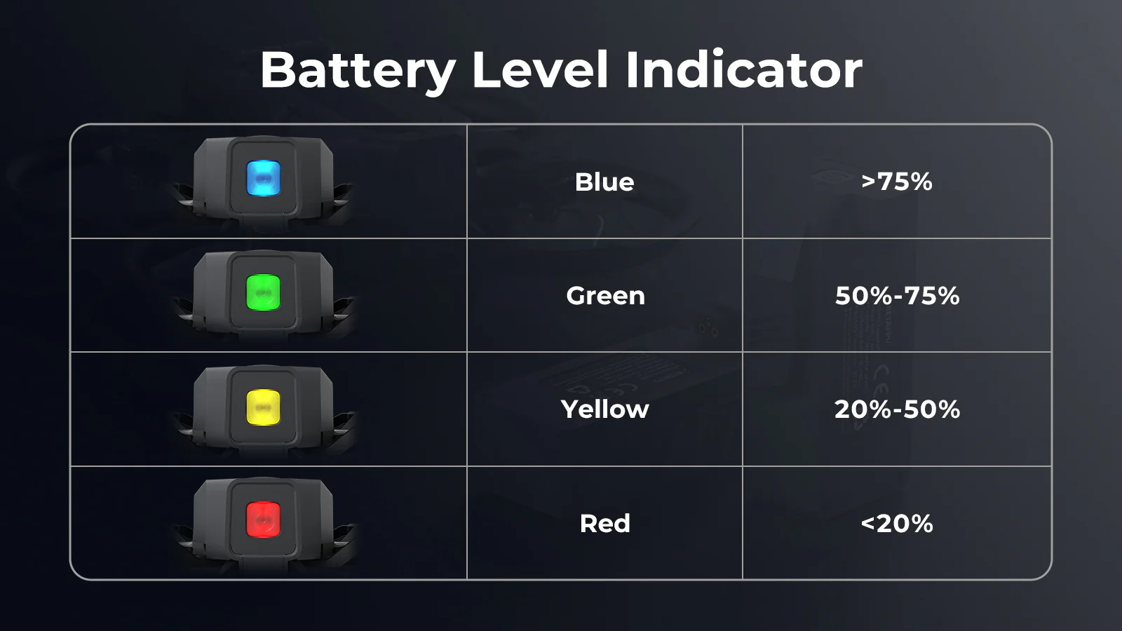 - • LED levels: Blue (75%+), Green (50–75%), Yellow (20–50%), Red (<20%)