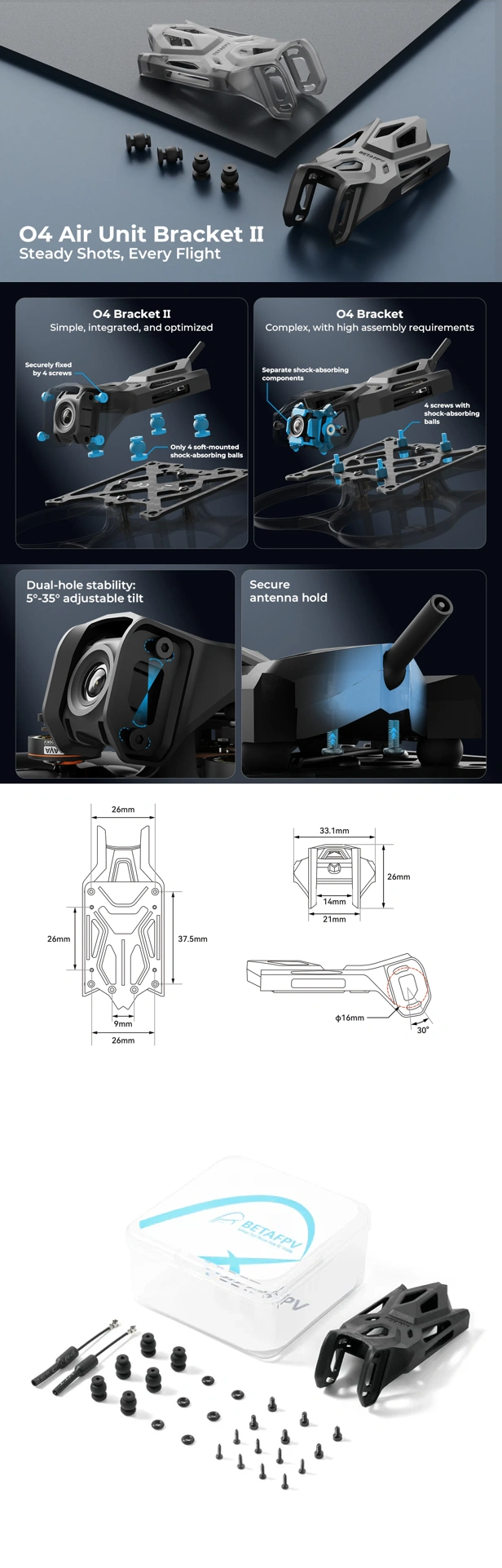The new BetaFPV O4 Air Unit Bracket II delivers stable and jello-free video. Featuring an integrated damping system with 4 soft-mounted balls, it isolates the DJI O4 camera from vibrations while keeping assembly simple and rigid. Just 4 screws secure the camera firmly, ensuring long-term stability and easy installation.