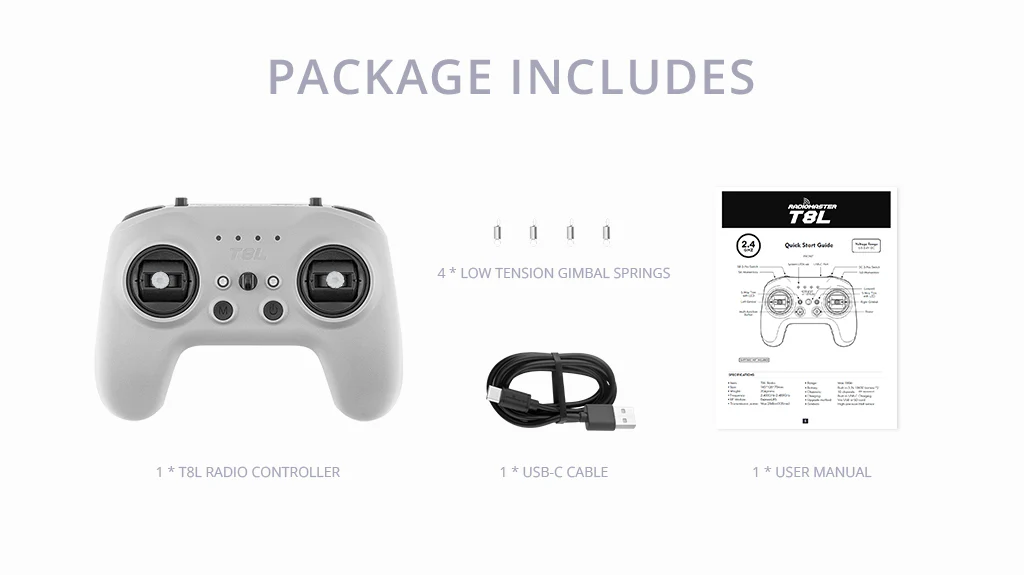With up to 10 channels via CRSF, high-precision quad-bearing Hall gimbals, and USB-C compatibility for charging and simulator use, the T8L is ideal for micro quads, park flyers, fixed-wing aircraft, and as a reliable portable backup radio.