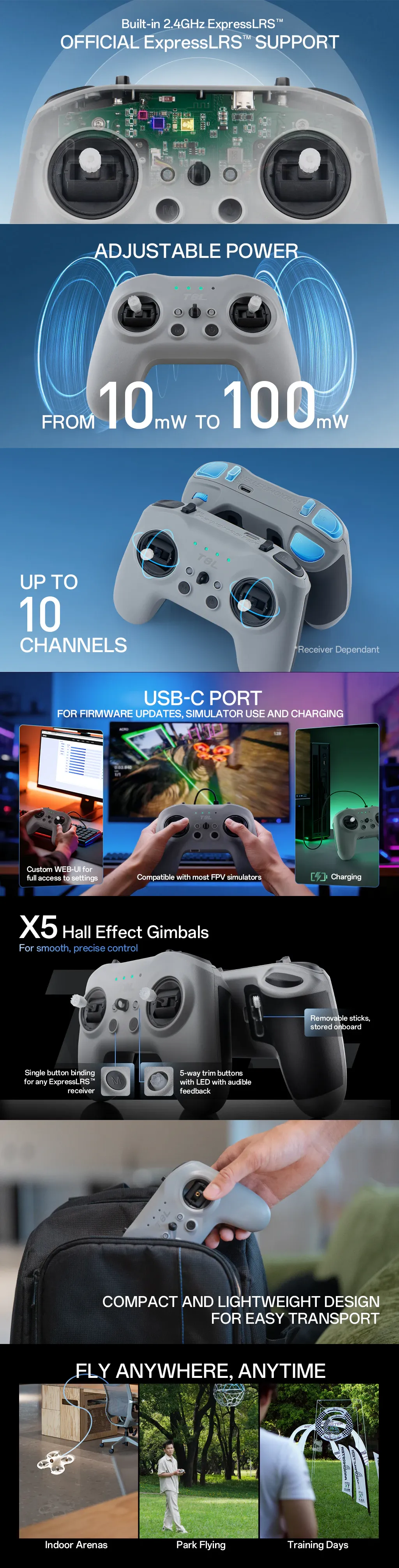 Compact ELRS 2.4GHz radio with WebUI, Hall gimbals and simulator support