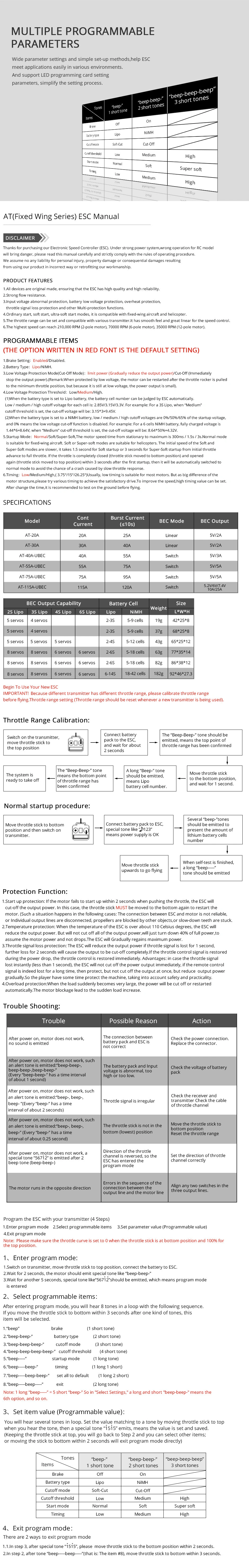 - • Protection: undervoltage, over-current, ESC overheat, throttle signal