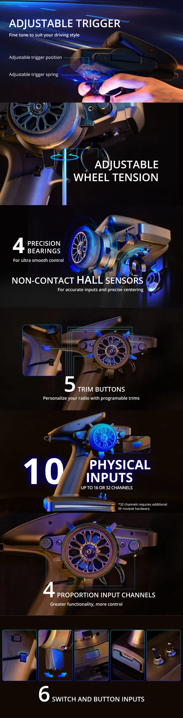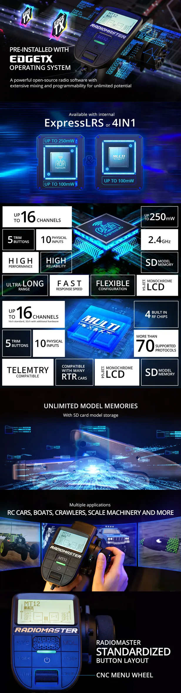 Nowa RadioMaster MT12 to przełom w segmencie aparatur Surface RC. Jako pierwsza na świecie obsługuje EdgeTX, ExpressLRS i Multi-Module 4in1, oferując pełną elastyczność i otwartość oprogramowania. Dzięki 10 fizycznym wejściom i obsłudze do 32 kanałów (z modułem 4in1), MT12 jest gotowa do każdego scenariusza – od samochodów RC, przez ciężarówki, aż po łodzie.