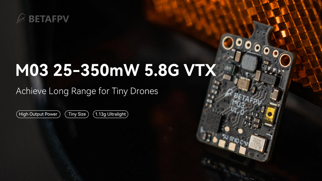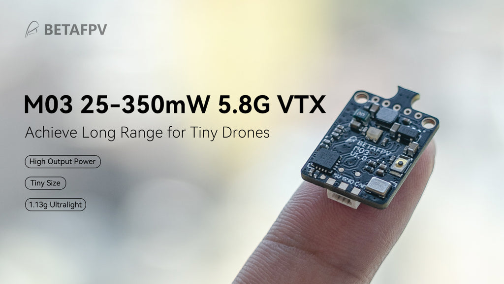 M03 VTX, a ultralight and high output power 5.8GHz analog VTX, is designed for 65-85mm whoop drone for longer range flying. Combining this VTX and the excellent radio link ExpressLRS 2.4G, pilots can fly whoop drones longer to explore more possibilities and fun.