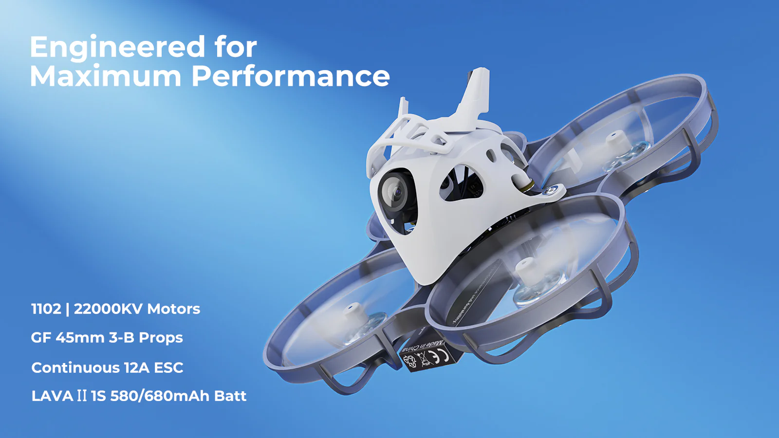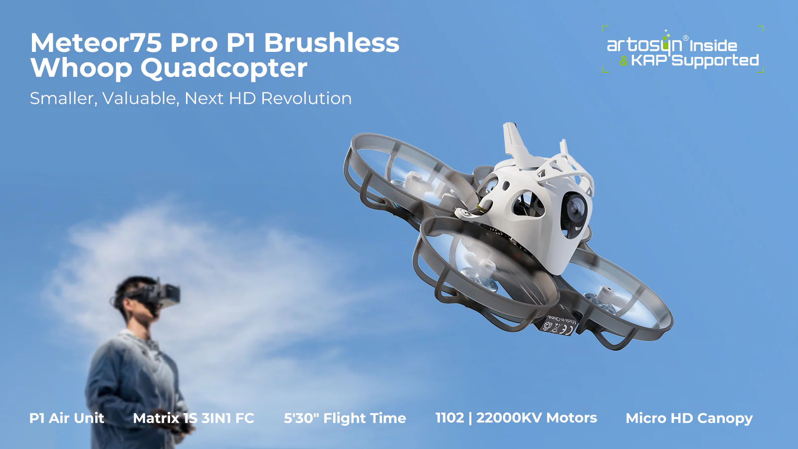 Meteor75 Pro P1 napędzany jest silnikami 1102 | 22000KV, trójłopatowymi śmigłami GF 45 mm, wzmocnionym regulatorem ESC o ciągłym prądzie 12 A oraz wydajnym akumulatorem LAVA II 1S 580 mAh / 680 mAh, co zapewnia doskonałą równowagę między mocą a efektywnością. Taki zaawansowany układ napędowy bez trudu radzi sobie z rozmiarem i masą jednostki P1 Air Unit, oferując imponujący czas lotu do 5:30 minuty. Dzięki temu zestawowi zasilania możesz z pełnym zaufaniem uzyskiwać płynne, wysokiej jakości ujęcia HD podczas każdego lotu.