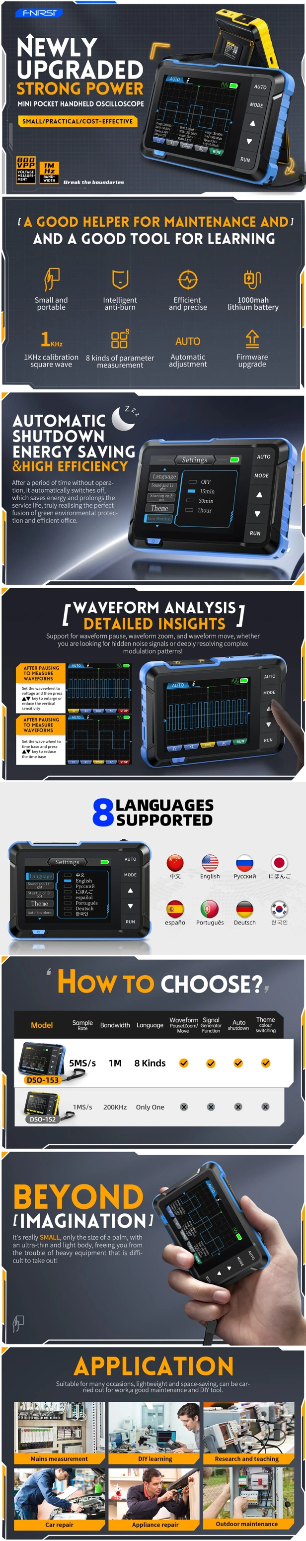FNIRSI DSO-153 to nowoczesny oscyloskop cyfrowy 2w1 zaprojektowany dla serwisantów, hobbystów oraz studentów elektroniki. Łączy kompaktowy rozmiar z imponującą funkcjonalnością: próbkowanie 5MS/s, pasmo 1MHz, pełne tryby wyzwalania i wbudowany generator sygnału 10kHz z 14 typami przebiegów. Dzięki trybowi One-Click AUTO umożliwia błyskawiczne wyświetlenie przebiegu bez skomplikowanej konfiguracji.